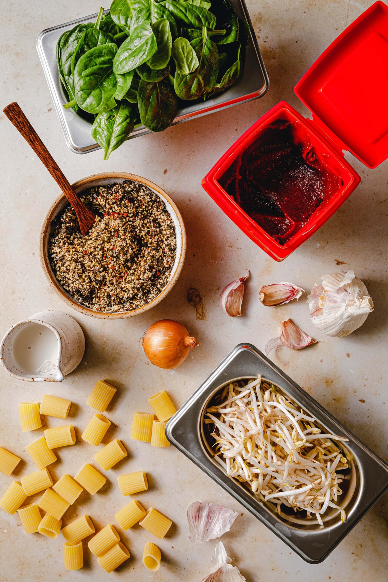 Die Bibimbap-Pasta, die eigentlich richtiger „Bibim-Pasta“ heißen sollte, ist in 15 Minuten fertig und somit absolut feierabendtauglich. Der Spinat und die frischen Mungobohnensprossen, selbst gezogen oder gekauft, werden mit heißem Wasser übergossen, dann die Nudeln gekocht. Währenddessen werden Zwiebel und Knoblauch gehackt, glasig gedünstet und zusammen mit der süß-scharfen Chili-Paste angebraten. Das Aromaspektakel löschen wir mit Hafersahne ab und balancieren so die Schärfe und Würze der Paste perfekt aus. Ein wenig stärkehaltiges Nudelwasser geben wir auch noch dazu, so haftet unsere leuchtende Sauce später noch besser an den Nudeln.