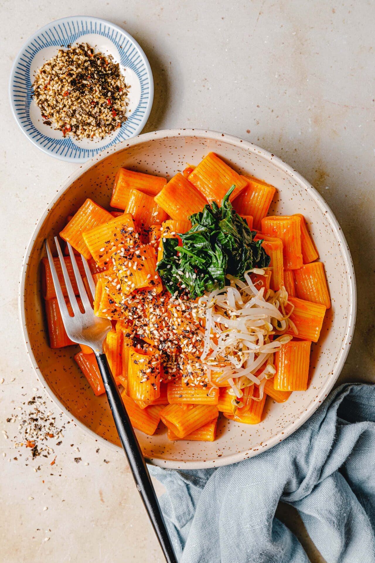 Also haben wir uns kurzerhand Pasta geschnappt und einfach losgelegt. Rigatoni passen hier besonders gut – die Sauce schmiegt sich perfekt um die Röhren. Und ja, auch bei den Toppings haben wir im Vergleich zu unserer Vorzeige-Bibimbap-Bowl etwas abgespeckt. Aber hey, selbst beim Original handelt es sich ursprünglich einfach um ein klassisches Resteessen. Also alles legitim.