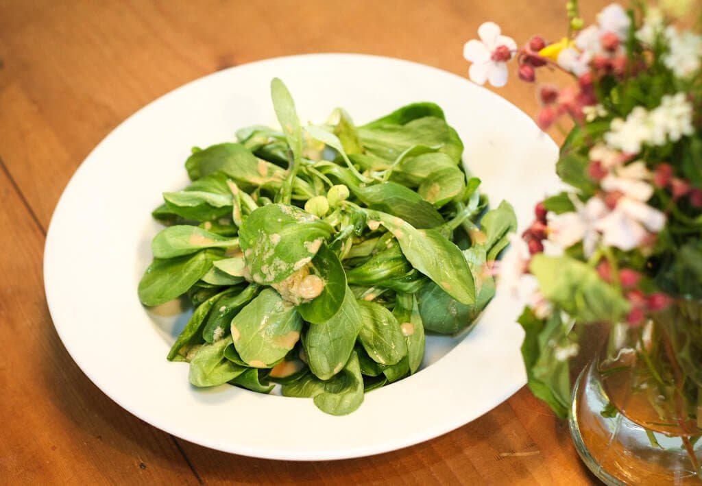 Wascht den Feldsalat gründlich in viel kaltem, klaren Wasser – es gibt nichts schlimmeres, als sandigen Salat auf der Gabel. Spült ihn anschließend gut aus und lasst ihn abtropfen oder schleudert ihn trocken. Wer keine Salatschleuder hat und die Küche ohnehin putzen muss, bekommt den Salat auch so trocken.
