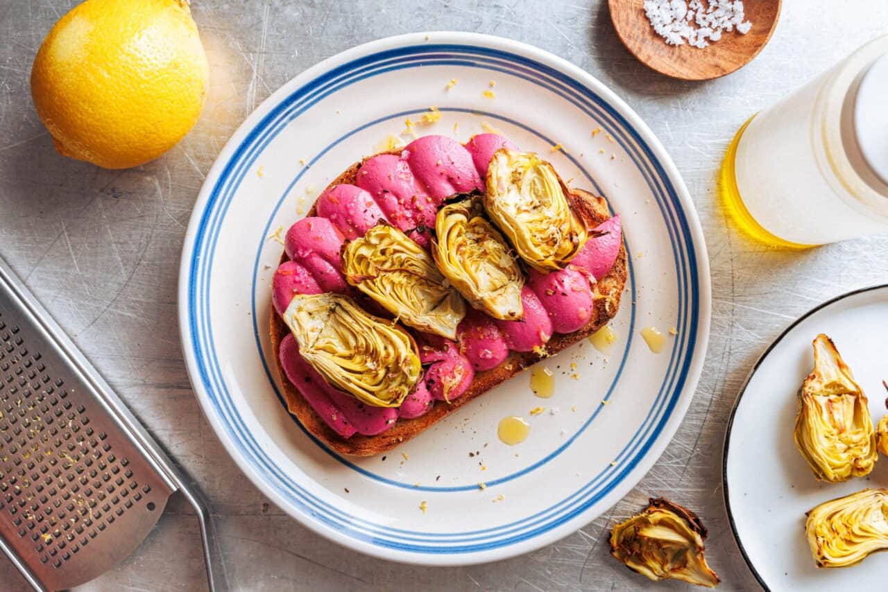 Auch ein Brot mit Aufstrich kann fancy sein: Unser schneller, cremiger pinker Tofu-Ricotta, getoppt mit gegrillten Artischocken ist (nicht nur) ein echter Augenschmaus.