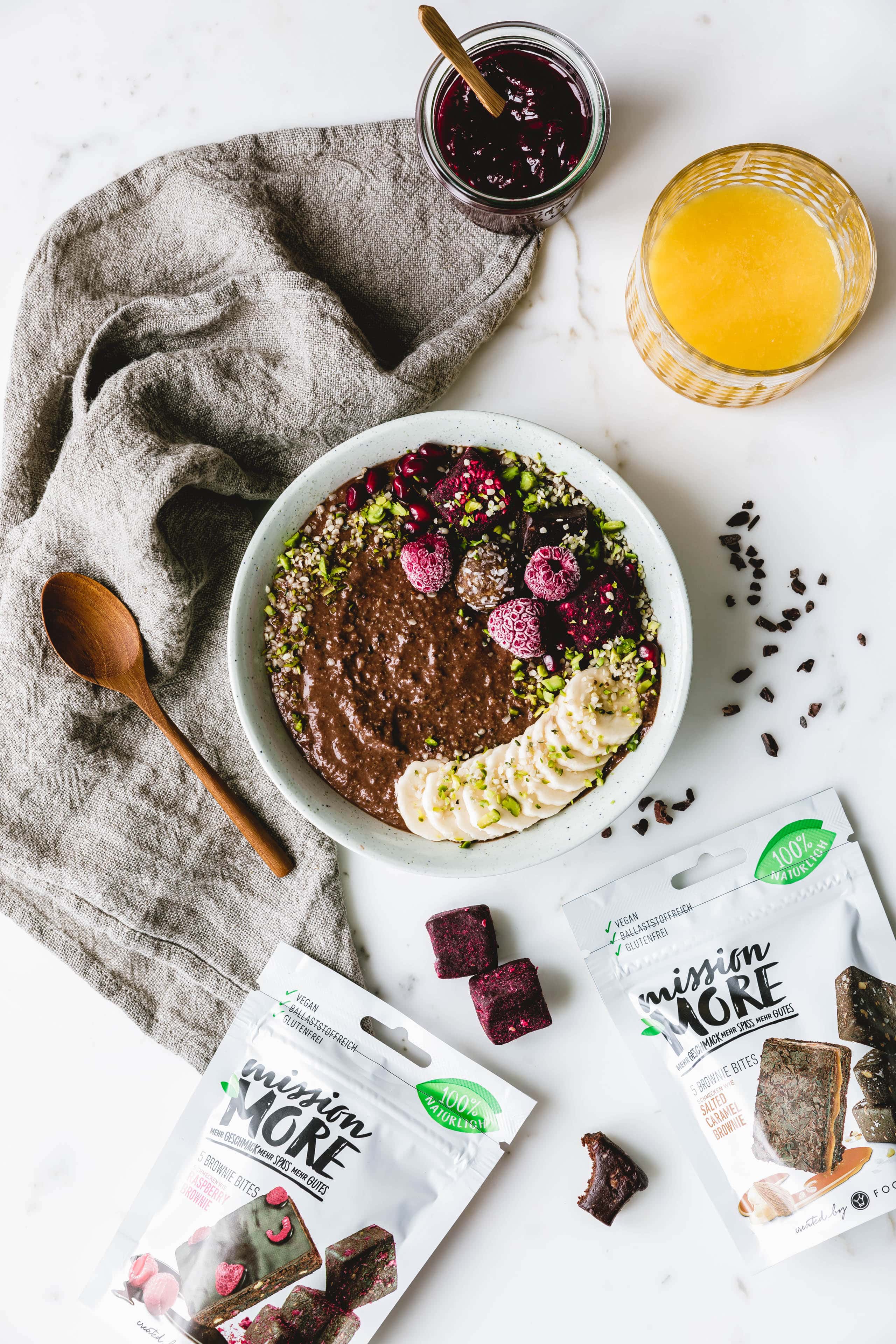 Und als wäre der Schoko-Frühstückspudding nicht schon Schlemmerei genug, passen die kleinen, brandneuen Brownie-Bites von Mission MORE wie die Faust auf’s Auge dazu. Die zwei neuen Sorten „Raspberry Brownie“ und „Salted Caramel Brownie“ (Achtung: Extreme Suchtgefahr) haben uns geschmacklich wirklich umgehauen – wir haben noch nie leckerere Energie-Snacks verdrückt! Also, außer unserer eigenen vielleicht, aber die muss man eben selbst vorbereiten.