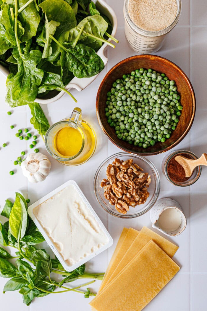 Die Zutaten für unsere vegane grüne Lasagne mit Erbsen und Tofu-Béchamel