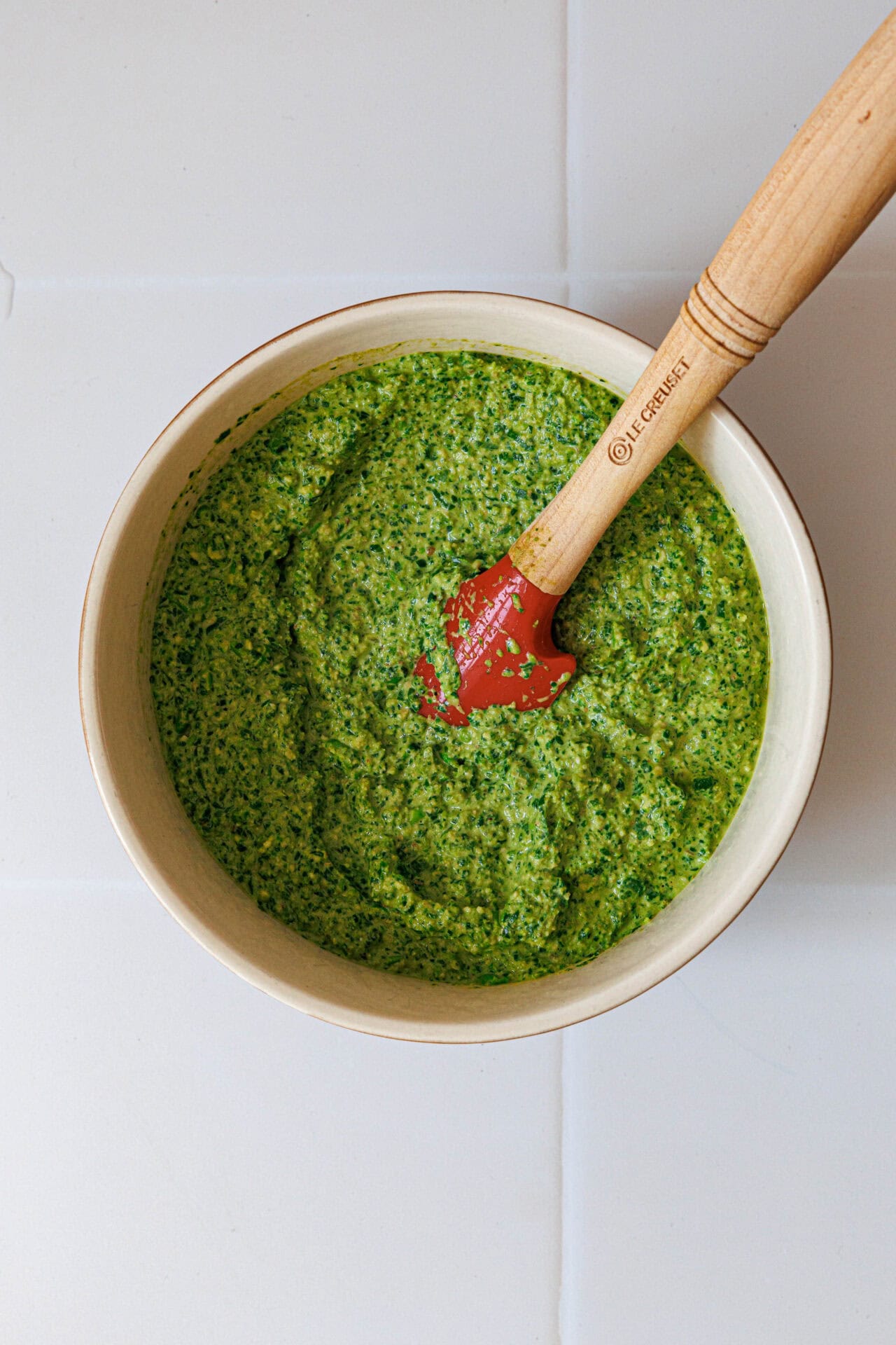 - Für das Erbsen-Pesto alle Zutaten cremig pürieren.75 g Tiefkühlerbsen, 150 g Spinat, 50 g Basilikum, 25 g Walnüsse, 2 Zehen Knoblauch, 1 EL Hefeflocken, 1 ½ TL Salz, 7 EL Olivenöl