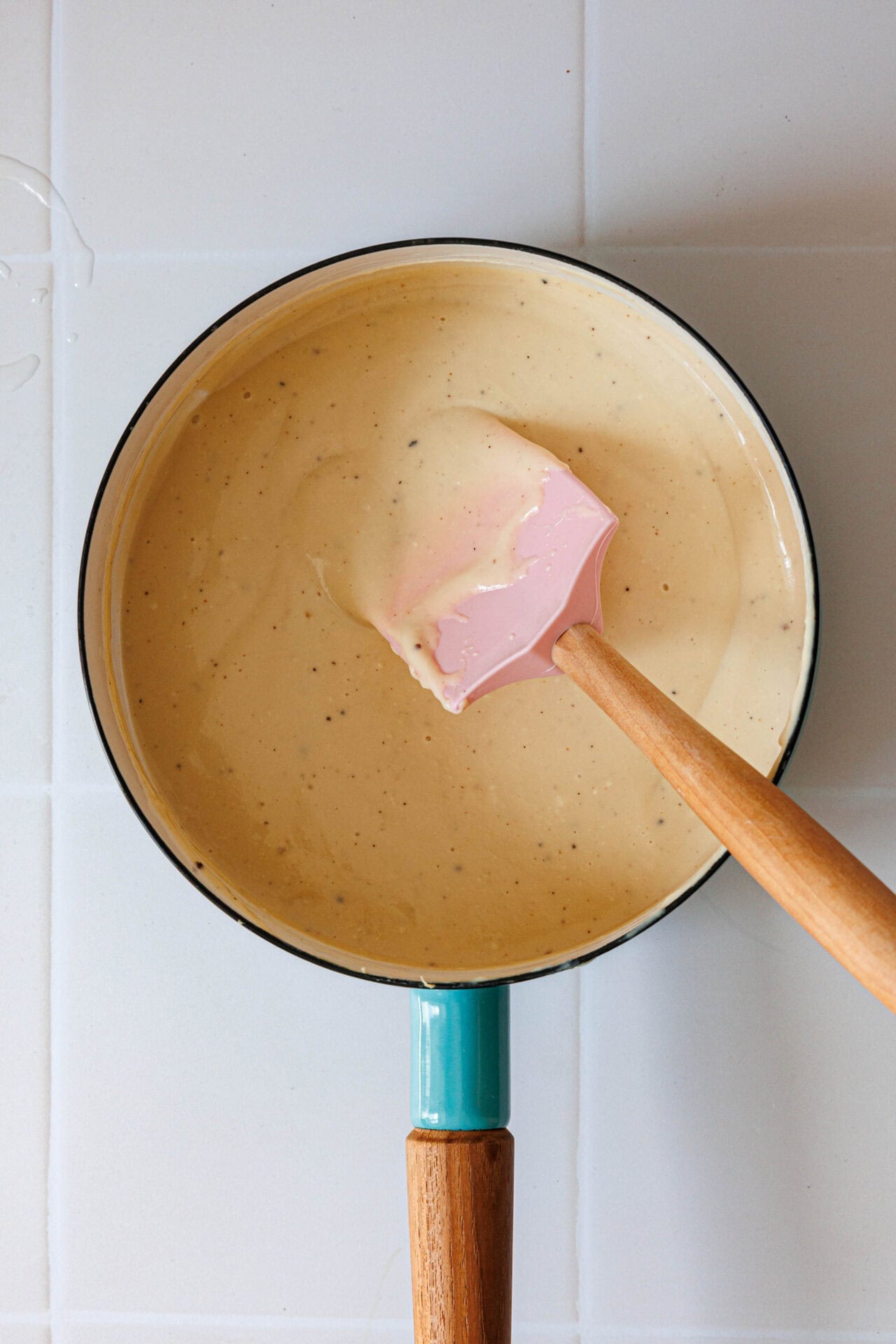 Für die leichte Béchamel mit extra Protein gebt ihr Seidentofu, Sojamilch, Hefeflocken, Tapiokastärke, eine Prise Muskatnuss, Salz und Pfeffer in den Mixer geben und verarbeitet alles zu einer glatten Sauce. Anschließend kochen wir das Ganze kurz auf, damit die Tapiokastärke die Sauce andickt. Ähnlich wie bei der veganen Mozzarella-Zubereitung sorgt die Tapiokastärke dafür, dass sich die Masse etwas „zieht“, als wäre Käse darin.