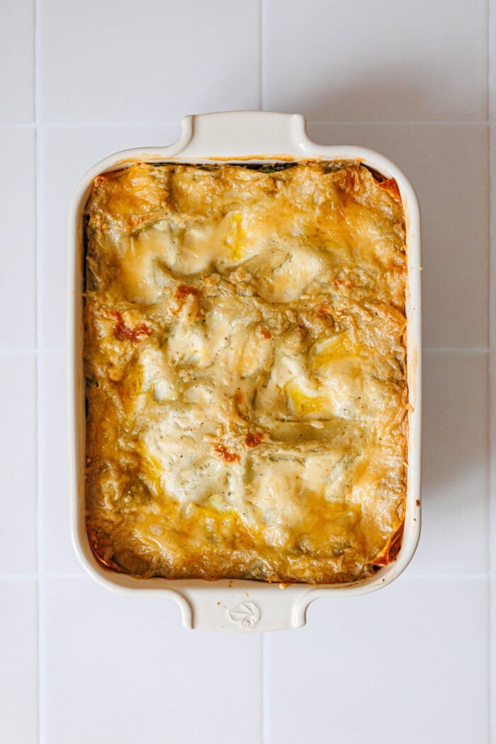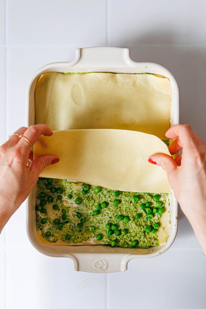 Beginnt mit einer dünnen Schicht Tofu-Béchamel auf dem Boden einer Auflaufform. Legt eine Schicht Nudeln darauf, gefolgt von einer Schicht Béchamel, dann Spinat-Erbsen-Pesto und ein paar extra Erbsen. Wiederholt das Schichten, bis alle Zutaten verbraucht sind, und schließt mit einer großzügigen Schicht Tofu-Béchamel ab. Bestreut die oberste Schicht mit pflanzlichem Käse und deckt die Lasagne (ausnahmsweise) mit Alufolie oder einem Deckel ab.