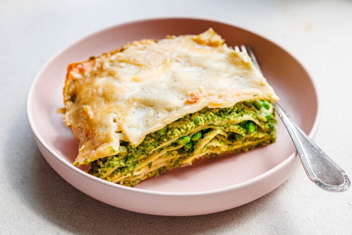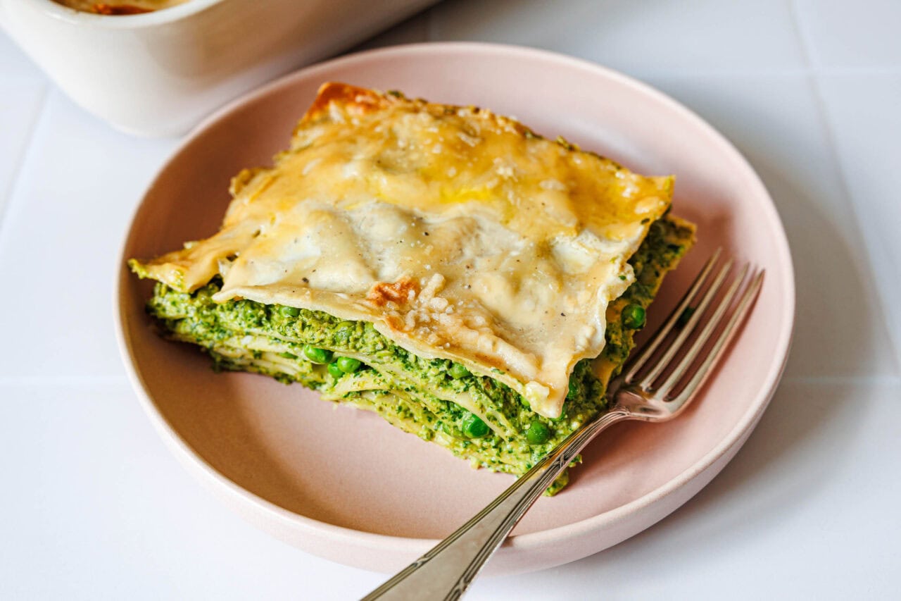Vegane grüne Lasagne mit Erbsen und Tofu-Béchamel