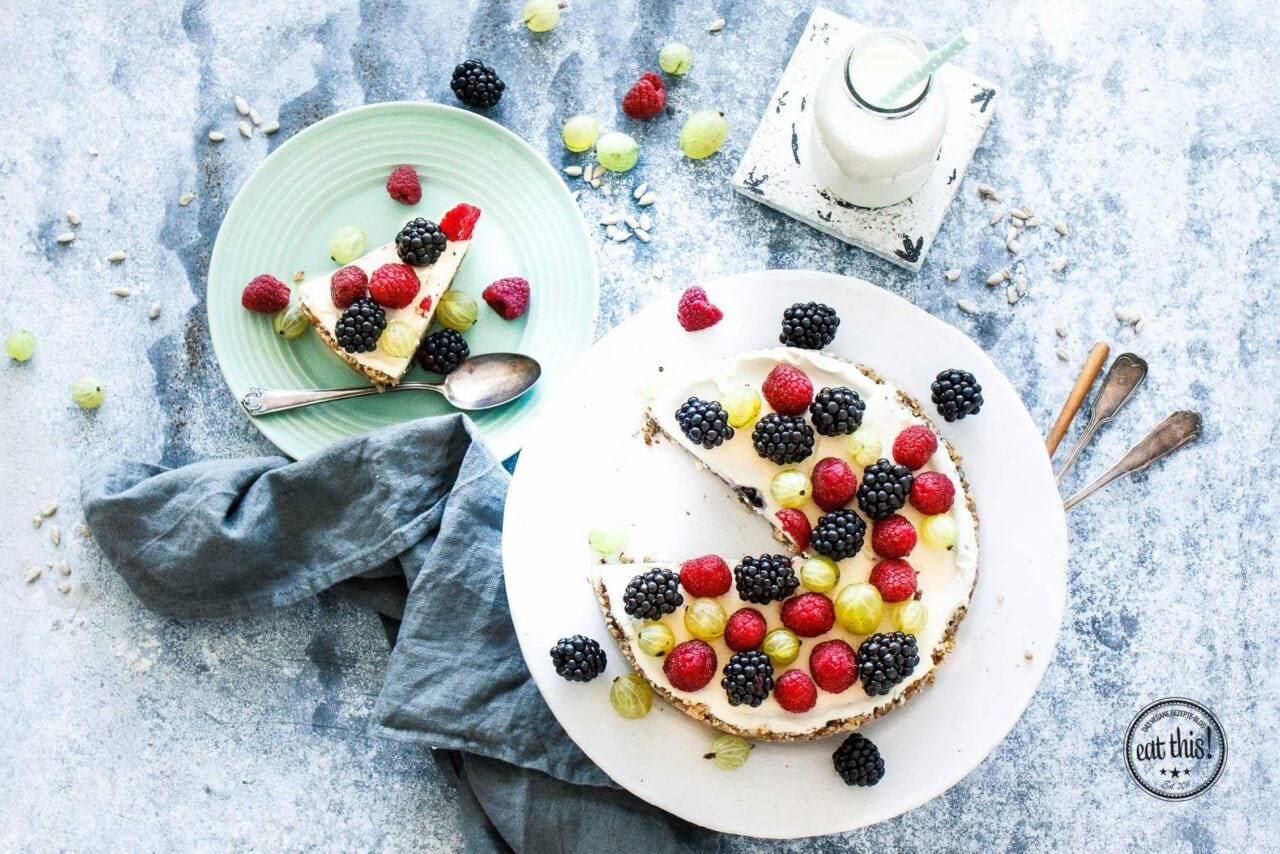 Für heiße Sommertage wollte ich jetzt einfach einen noch leichteren Kuchen, von dem man locker auch mal zwei oder drei Stückchen beim gemütlichen Kaffeeklatsch verputzen kann. Dafür habe ich einfach mehr als die Hälfte der üblichen Cashewfüllung mit frischem veganen Quark ersetzt.