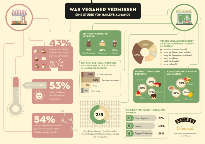 Neben dem Eiskaffee werden übrigens laut der Baileys-Studie hauptsächlich alte Klassiker wie Cappuccino, heiße Schokolade, Käsekuchen, Pudding und Eiskonfekt im Angebot der Cafés und Restaurants vermisst. Gerade bei veganen Desserts bleibt der Ofen sprichwörtlich aus.