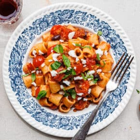 Pasta mit der Sauce vermengen und mit zerkrümeltem Feta und Basilikumblättern getoppt sofort servieren.