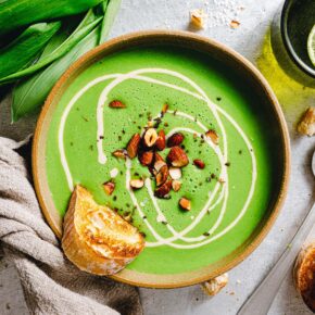 Erbsen und Hafersahne zur Suppe geben und weitere 5 Minuten kochen lassen, bis die Kartoffeln weich sind. Topf vom Herd nehmen, Bärlauch grob gehackt unterrühren.