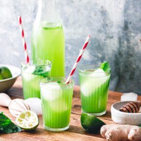 Alle Zutaten bis auf die Eiswürfel in einen High-Speed-Blender geben und glatt mixen.