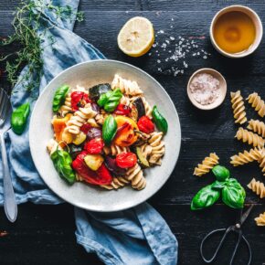 EDEKA Selection Fusilloni nach Packungsanweisung kochen, anschließend abgießen und sofort mit der Kichererbsensauce vermischen. Geröstetes Gemüse unterheben und mit Basilikumblättern toppen.