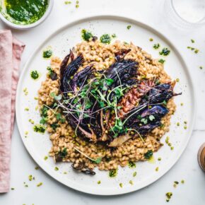 Wir feiern großes Zutatenrevival für die Gerste! Mit einem einfachen, absolut weeknight-kompatiblen Graupenrisotto, knusprig-saftigen Rotkohlspalten aus dem Ofen und einem Pesto aus Microgreens von unseren Freunden von Heimgart.