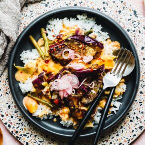 Cremiges Erdnusscurry mit Sommergemüse, getoppt mit den unverschämtesten Auberginen, die dir je aus der Pfanne gehüpft sind. Lieblingsrezept-Potenzial!
