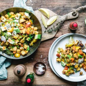 Selleriepfanne mit Avocadowürfeln und Schalotten toppen und mit Zitronenspalten und deiner liebsten Hot Sauce servieren.