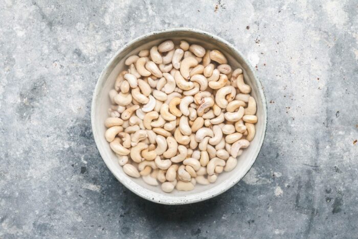 Cashewkerne mindestens 3 Stunden, besser über Nacht, in reichlich kaltem Wasser einweichen. Anschließend abgießen und die Kerne unter fließendem, kaltem Wasser abspülen.